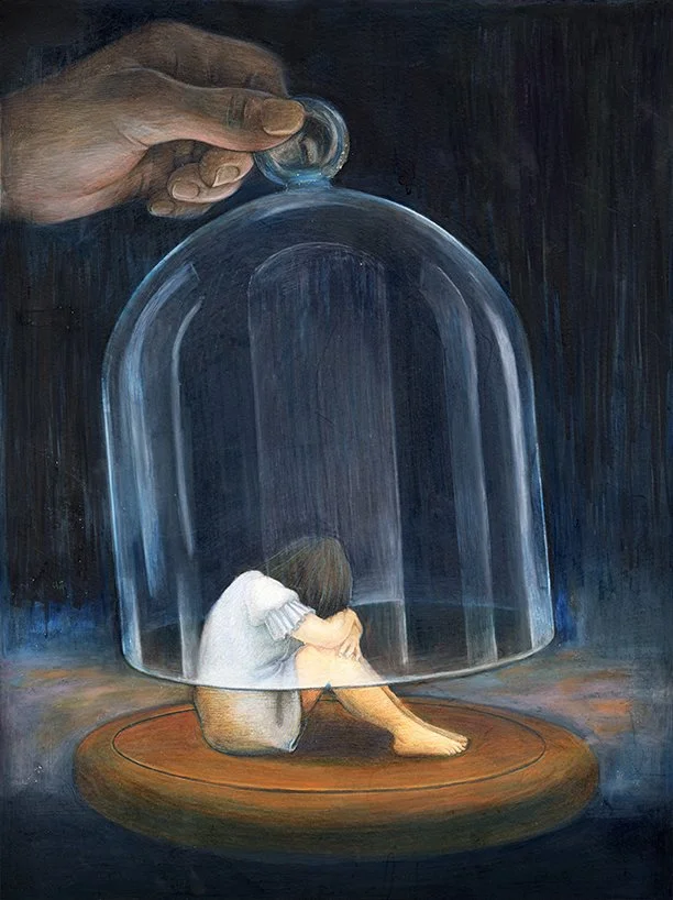 This work was created for the article titled “How can I stop feeling lonely?“. A depressive atmosphere was drawn with a dark-blue background. However, the background became bright and warm where the bell jar is opened to show the child stops loneliness.